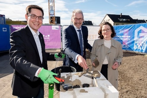 Am 14.März 2024 legte Uwe Eichner, Vorsitzender der VIVAWEST-Geschäftsführung, gemeinsam mit Bürgermeister Dr. Max Leitterstorf, den beteiligten Projektpartnern und weiteren Gästen den symbolischen Grundstein.