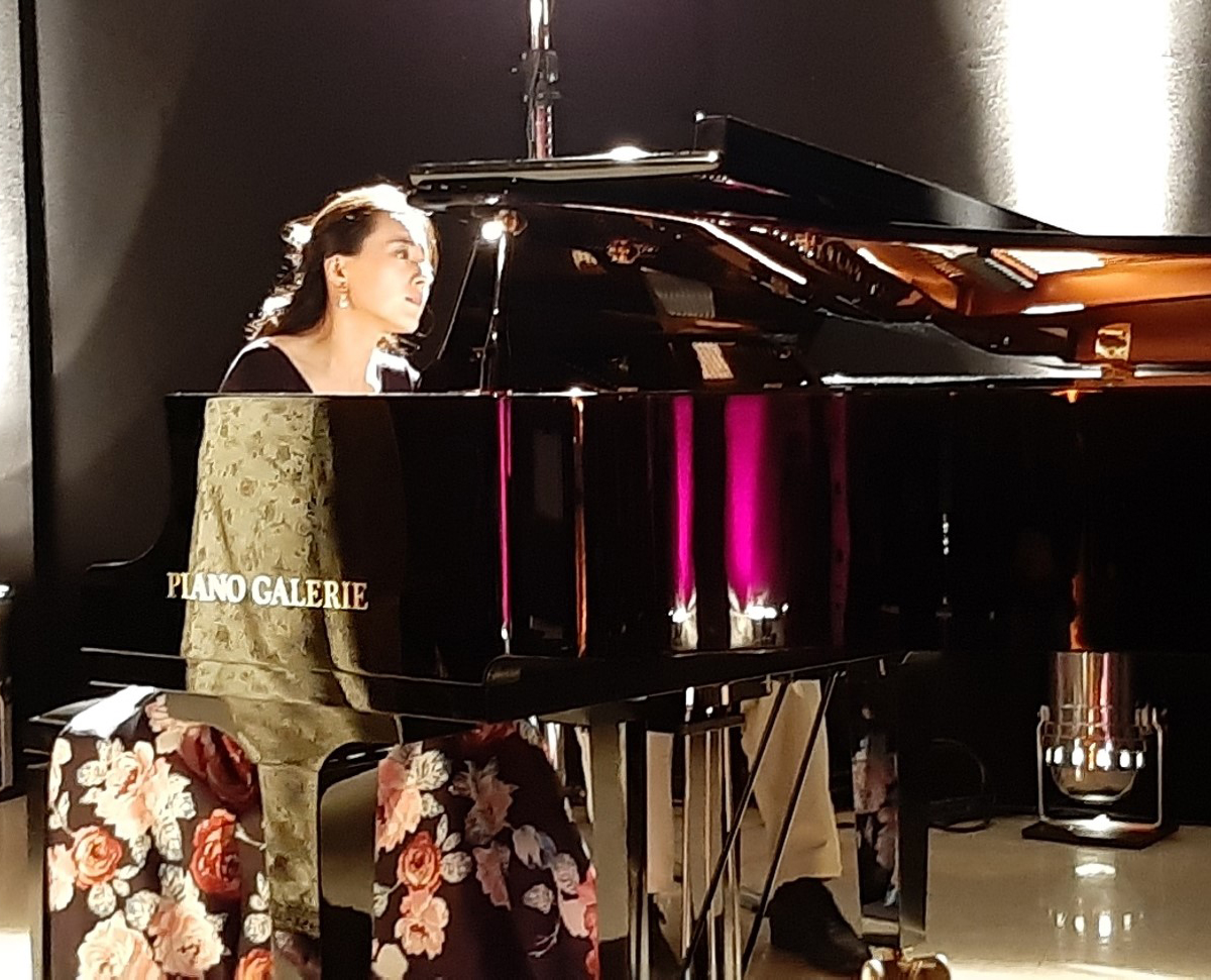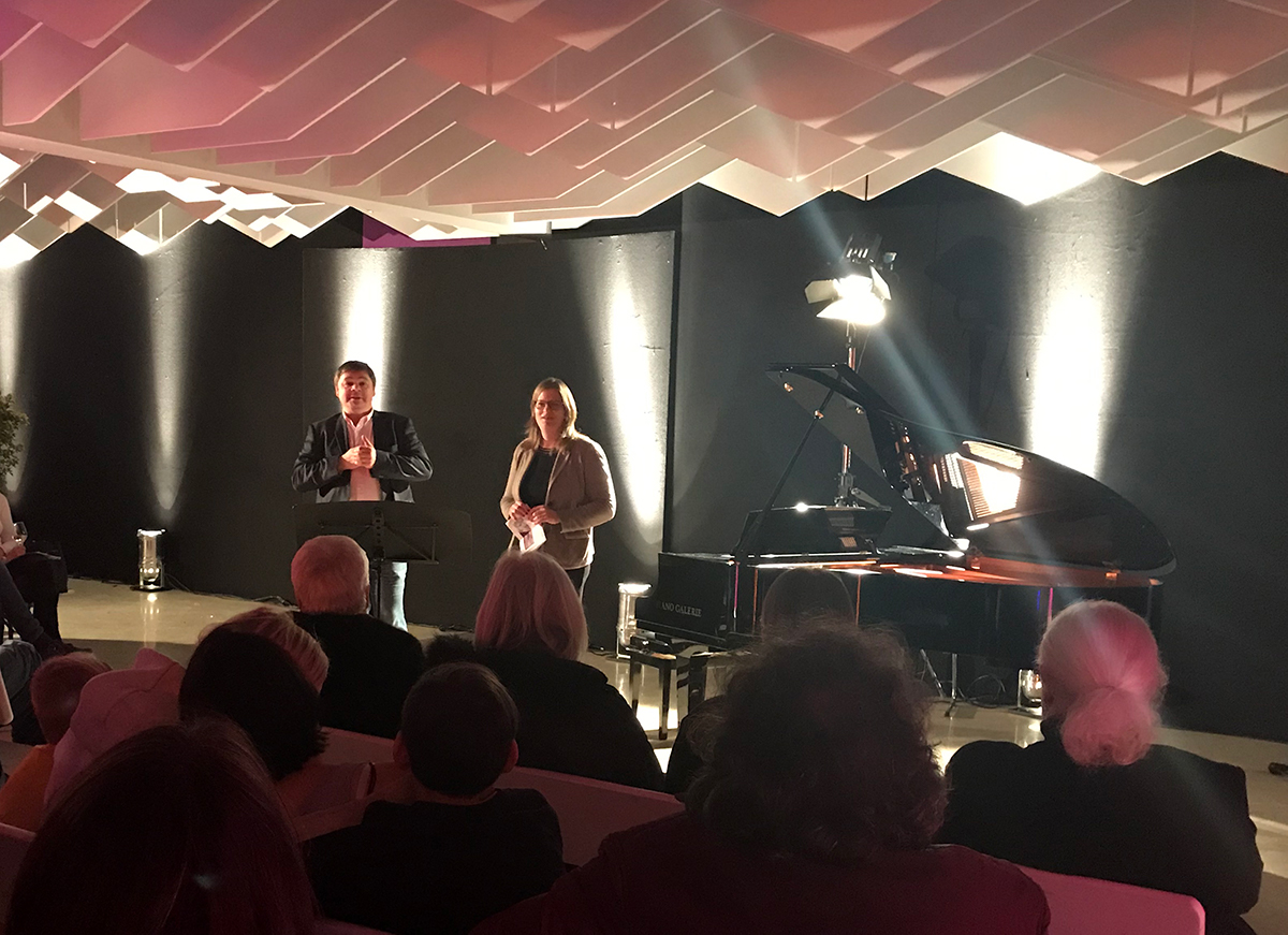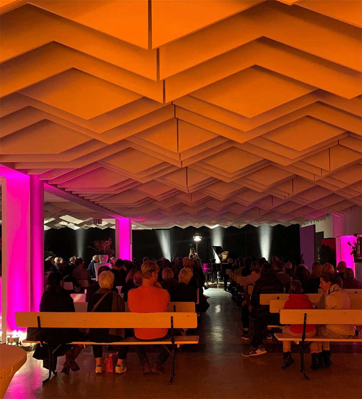 Die Kantine bot an diesem Abend mit den farbig ausgeleuchteten Original-Deckenelementen aus den 60er Jahren eine beeindruckende wie auch akustisch perfekte Kulisse für das Hauskonzert (vgl. Fotos). Die vielfach prämierten Musiker Viktoria Elisabeth Kaunzner (Violine), Aaron Seidenberg (Horn) und YaoYao Brandenburg (Klavier) machten Ludwig van Beethoven mit dem Programm „Sonate x 4“ alle Ehre.