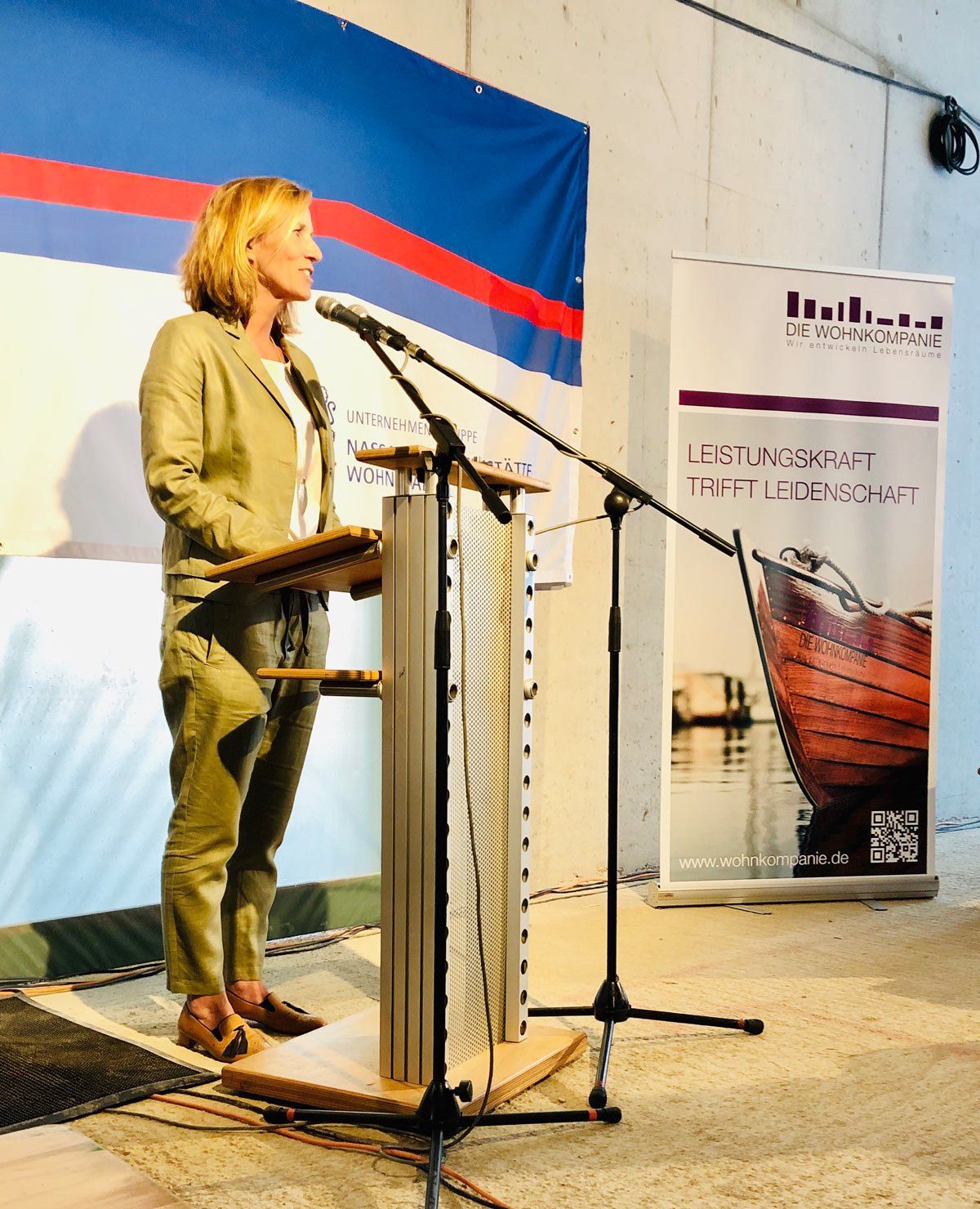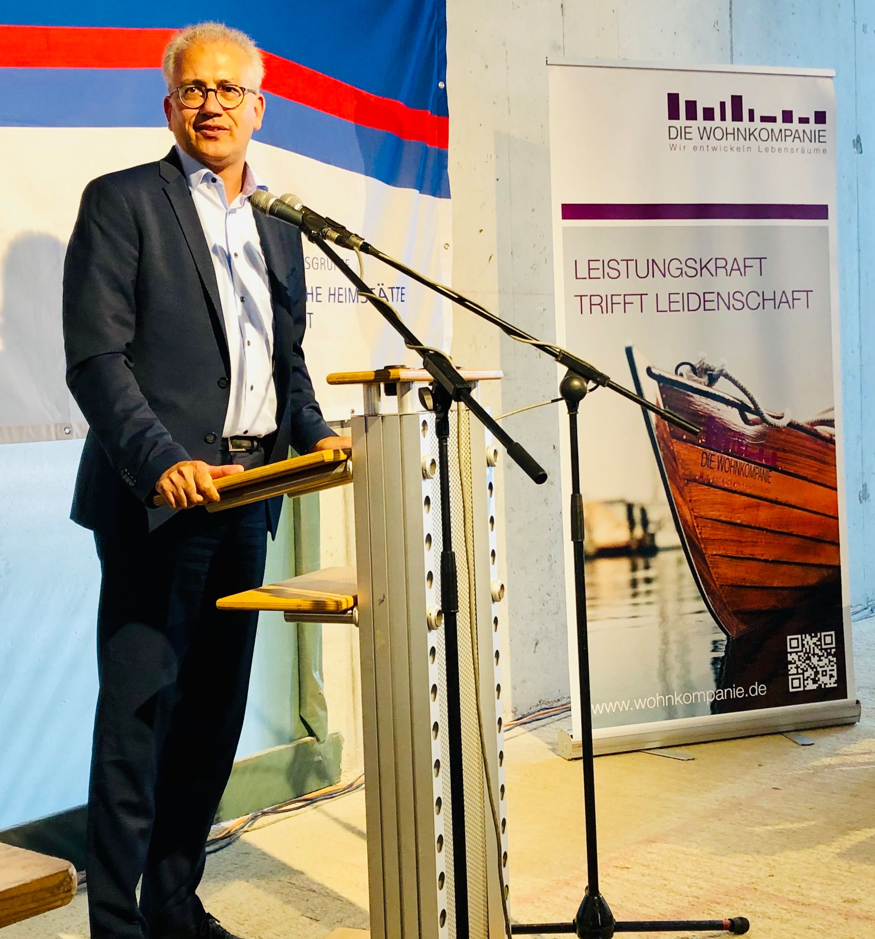Offenbach – Es ist das aktuell größte Wohnungsbauprojekt in Offenbach: Zwischen der Berliner Straße, dem Goethering und der Bernardstraße realisiert DIE WOHNKOMPANIE Rhein-Main – verantwortlich für Baurechtschaffung sowie Gesamtentwicklung des Areals – für die Unternehmensgruppe Nassauische Heimstätte/Wohnstadt (NHW) das Goethequartier. Auf der jahrelang brachliegenden, mehr als 1,8 Hektar großen Gewerbe- und Lagerfläche zwischen Kaiserlei-Kreisel und S-Bahn-Haltestelle „Ledermuseum“ ist der Rohbau für 327 Mietwohnungen sowie Einzelhandels-, Büro-und Gewerbeflächen abgeschlossen. Von den 83 geförderten Wohnungen werden 74 barrierefrei angelegt. Die Bezugsfertigstellung des ersten und zweiten Realisierungsabschnitts (227 Wohnungen) ist für 2020 geplant. Der dritte Realisierungsabschnitt (100 Wohnungen) nebst dem Edeka-Markt und der Kindertagesstätte ist für Ende 2020 avisiert. Am Donnerstag feierten die Unternehmen mit den Geschäftsführerinnen Iris Dilger (WOHNKOMPANIE) und Monika Fontaine-Kretschmer (NHW) für das Bauvorhaben Richtfest. Der hessische Wohnungsbauminister und Aufsichtsratsvorsitzender der NHW Tarek Al-Wazir sowie Offenbachs Oberbürgermeister Felix Schwenke hoben in ihren Grußworten die Bedeutung des Projekts für den Wohnungsmarkt in Rhein-Main hervor. „Unser Ziel ist, dass Jede und Jeder in Hessen eine Wohnung zu einem angemessenen Preis finden kann“, sagte Minister Al-Wazir. „Die Landesregierung stellt dazu bis 2024 rund 2,2 Mrd. Euro für den sozialen Wohnungsbau bereit. Das Projekt Goethequartier, für das wir heute Richtfest feiern, fördern wir ebenfalls mit 8,5 Millionen Euro. Die Unternehmensgruppe Nassauische Heimstätte | Wohnstadt als landeseigenes Wohnungsunternehmen ist ein wichtiger Partner, um dieses ambitionierte Ziel zu erreichen. Ihr Wohnungsbestand wird auf mindestens 75.000 Wohnungen anwachsen, das Goethequartier ist ein Baustein auf dem Weg“, so Al-Wazir.