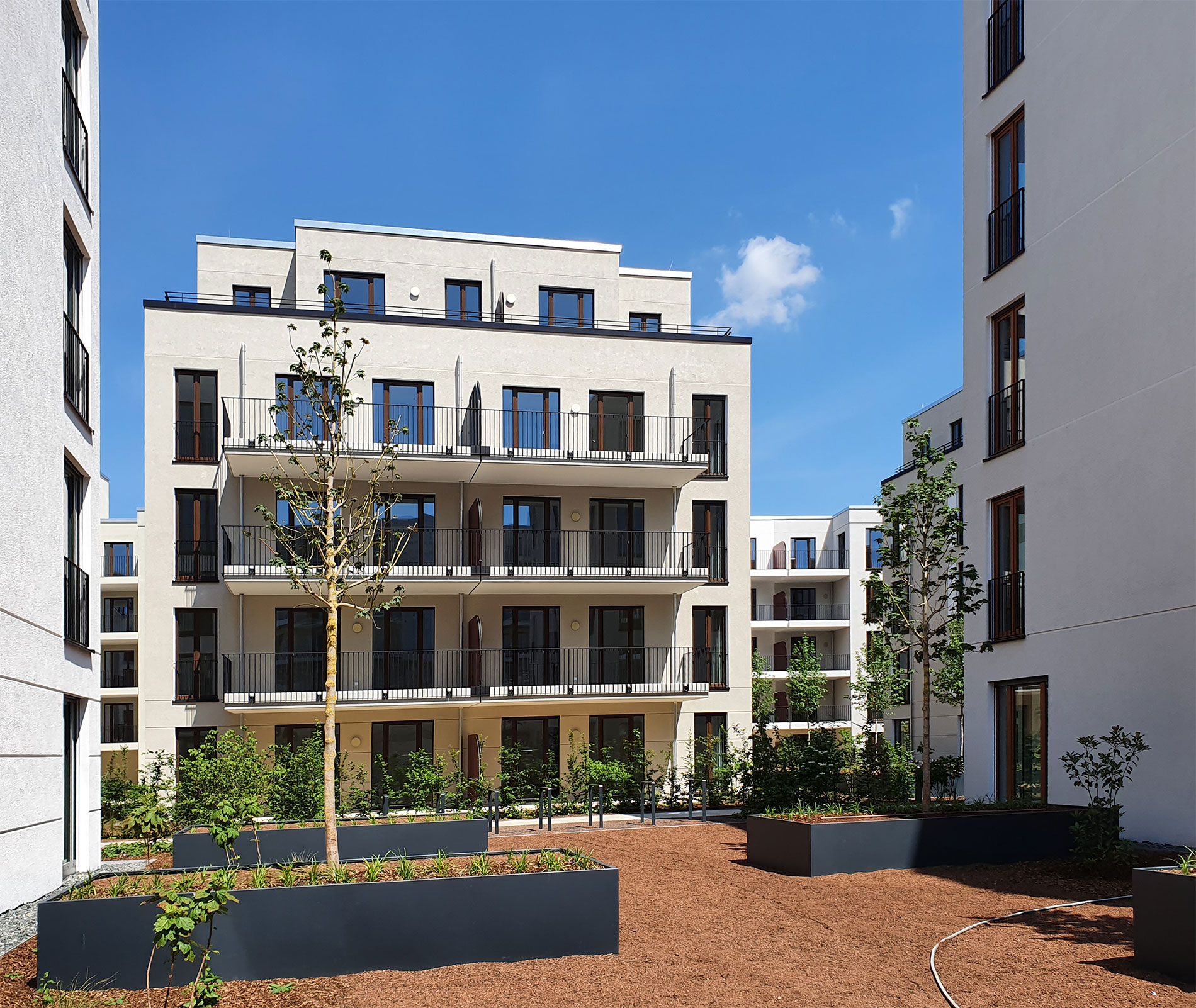 Das neue Quartier wird mit einer modernen Blockrandbebauung und einem intensiv begrünten Innenhof errichtet. Im verkehrsfreien Innenhof entstehen sieben einzelne Stadtvillen. In die größte Fläche wird ein Edeka mit 2.000 m² Verkaufsfläche einziehen.