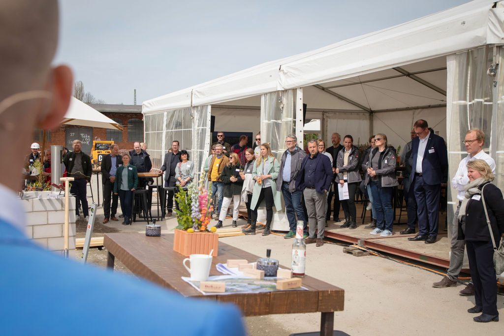 Lübeck, 08.05.2023. Die ersten Baugruben sind ausgehoben, die Kräne aufgestellt, der Beton fließt. Am 4. Mai 2023 erfolgte die Grundsteinlegung für die Neue Meile – St. Lorenz Lübeck. Rund 100 geladene Gäste, darunter Lübecks Bürgermeister Jan Lindenau, feierten mit der DIE WOHNKOMPANIE Nord diesen wichtigen Schritt auf dem Weg zur Fertigstellung des Quartiers. Im Festzelt lauschten die Gäste unter anderem den Grußworten von Lübecks Bausenatorin Joanna Hagen und Karin Loosen, Geschäftsführerin des Architektenbüros LRW Architekten und Stadtplaner, welches den Wohnungsbau der Neuen Meile umsetzt.