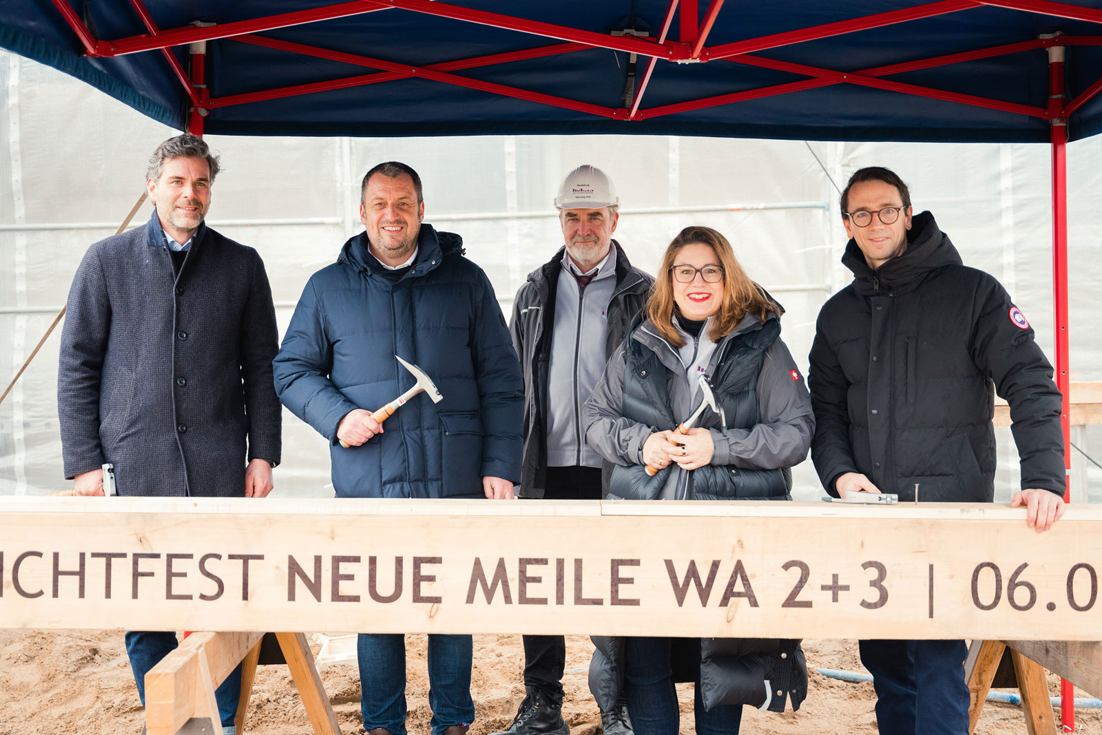 Lübeck, 07.02.2024. DIE WOHNKOMPANIE Nord und HAMBURG TEAM feierten gestern Richtfest für die Wohnbaufelder 2 und 3 des Neubauquartiers „Neue Meile“, das im Lübecker Stadtteil St. Lorenz realisiert wird. Auf den beiden Baufeldern entstehen zwei Wohnanlagen mit insgesamt 233 Wohneinheiten, die bereits im Juni 2022 im Rahmen eines Forward Deals von der HAMBURG TEAM Investment Management GmbH - für ihre beiden Sondervermögen „HAMBURG TEAM Urbane WohnWerte II“ sowie „HAMBURG TEAM Nord- deutsche WohnWerte“ - erworben wurden.