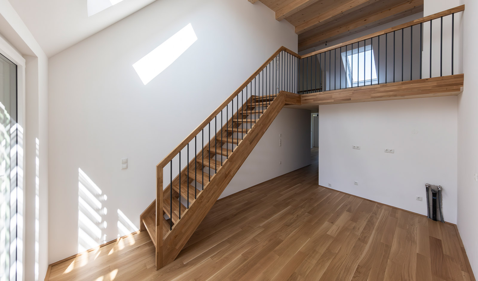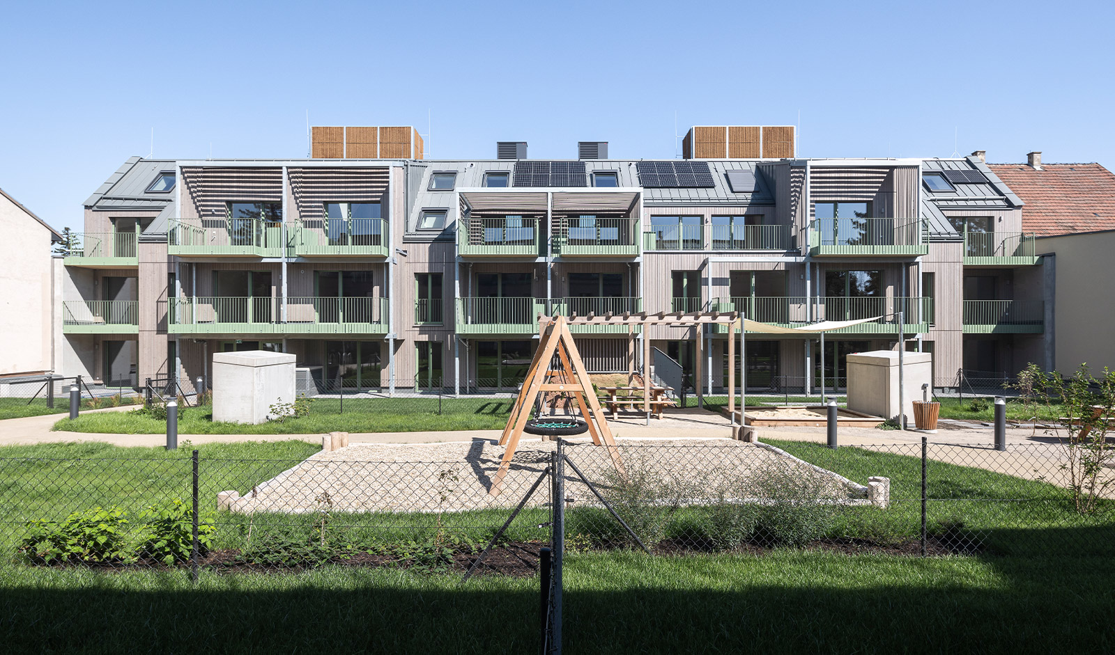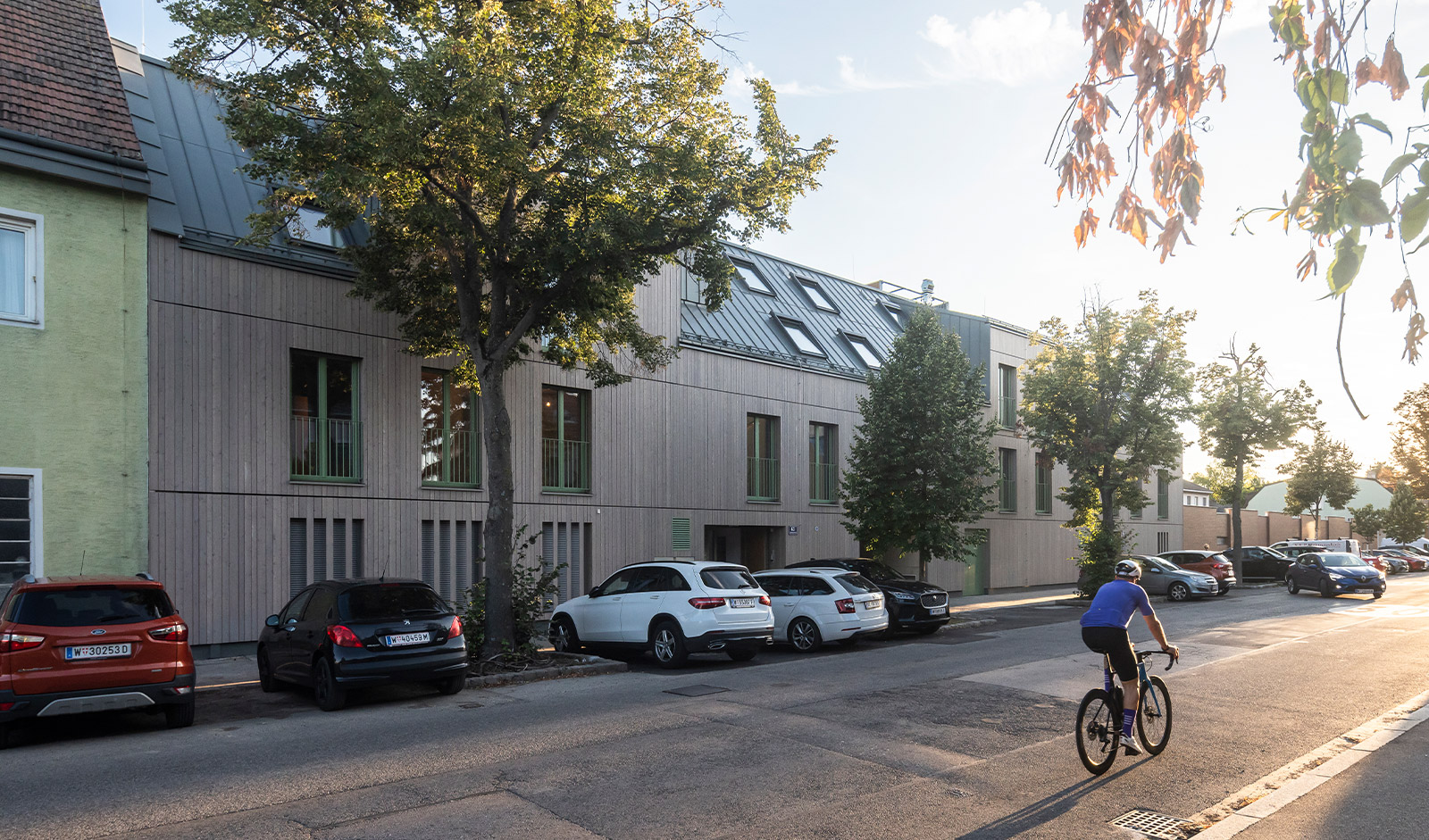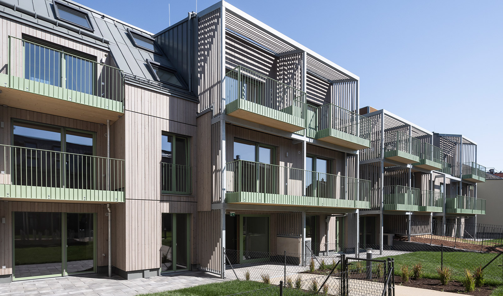Ganz im Trend von Ökologie, Ressourcenschonung und Nachhaltigkeit steht das Projekt Timberlaa am ländlich geprägten Stadtrand von Wien. Die beiden Häuser mit insgesamt 38 Wohnungen wurden in Holzbauweise erstellt und erfüllen alle Kriterien eines Niedrigenergiestandardhauses, sowie die ESG-Kriterien der EU-Taxonomie. Durch den Einsatz von Holz und dem hohen Vorfertigungsgrad konnten bis zu 75 Prozent der üblichen Kohlenstoffemissionen eingespart werden. Die Wände und Decken sorgen durch den Einsatz von Holz für ein heimeliges Wohngefühl, ein positives Raumklima und gesunden Schlaf. Die Fassade wurde aus vorvergrauter Lärche hergestellt, wodurch die Optik dauerhaft erhalten bleibt und eine hohe Lebensdauer ohne weiteren Wartungsaufwand gewährleistet ist.