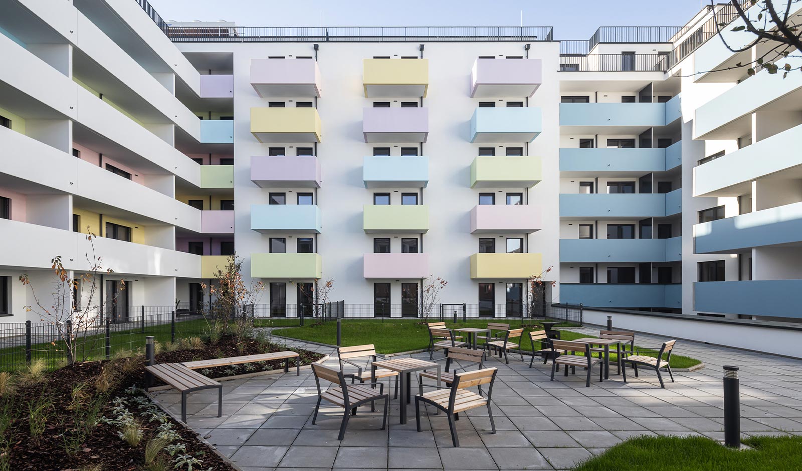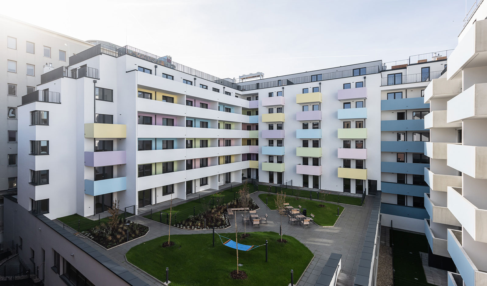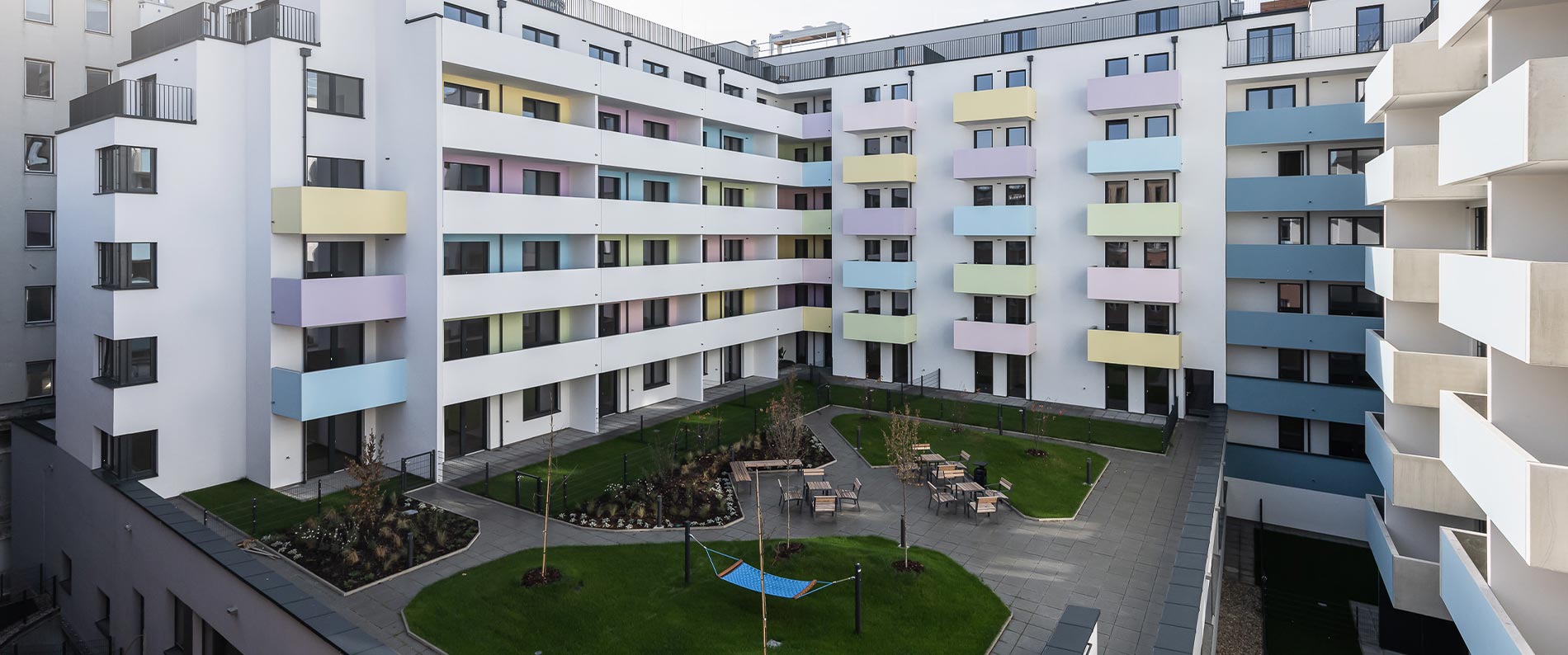 Auf einer ehemalig voll bebauten Gewerbebrache ist nun modernes Wohnen entstanden. Die Wohnungen im Erdgeschoß und im ersten Obergeschoß verfügen über Eigengärten, die übrigen haben Balkone und Loggien. Die beiden großzügig begrünten Innenhöfe sorgen für eine ruhige Lage direkt an der Dresdner Straße, die Erhöhung des Grünanteils verringert darüber hinaus den Hitzeinseleffekt der Liegenschaft.