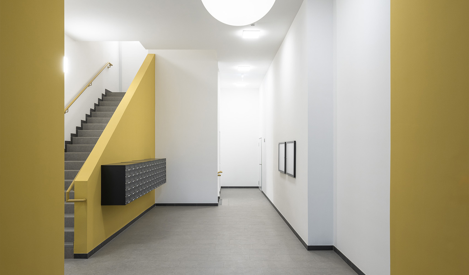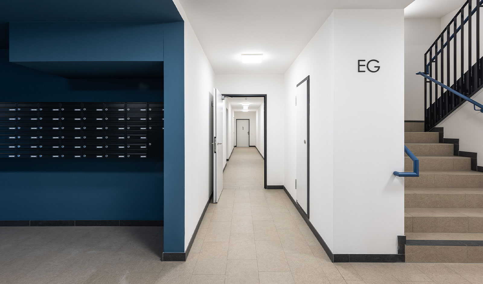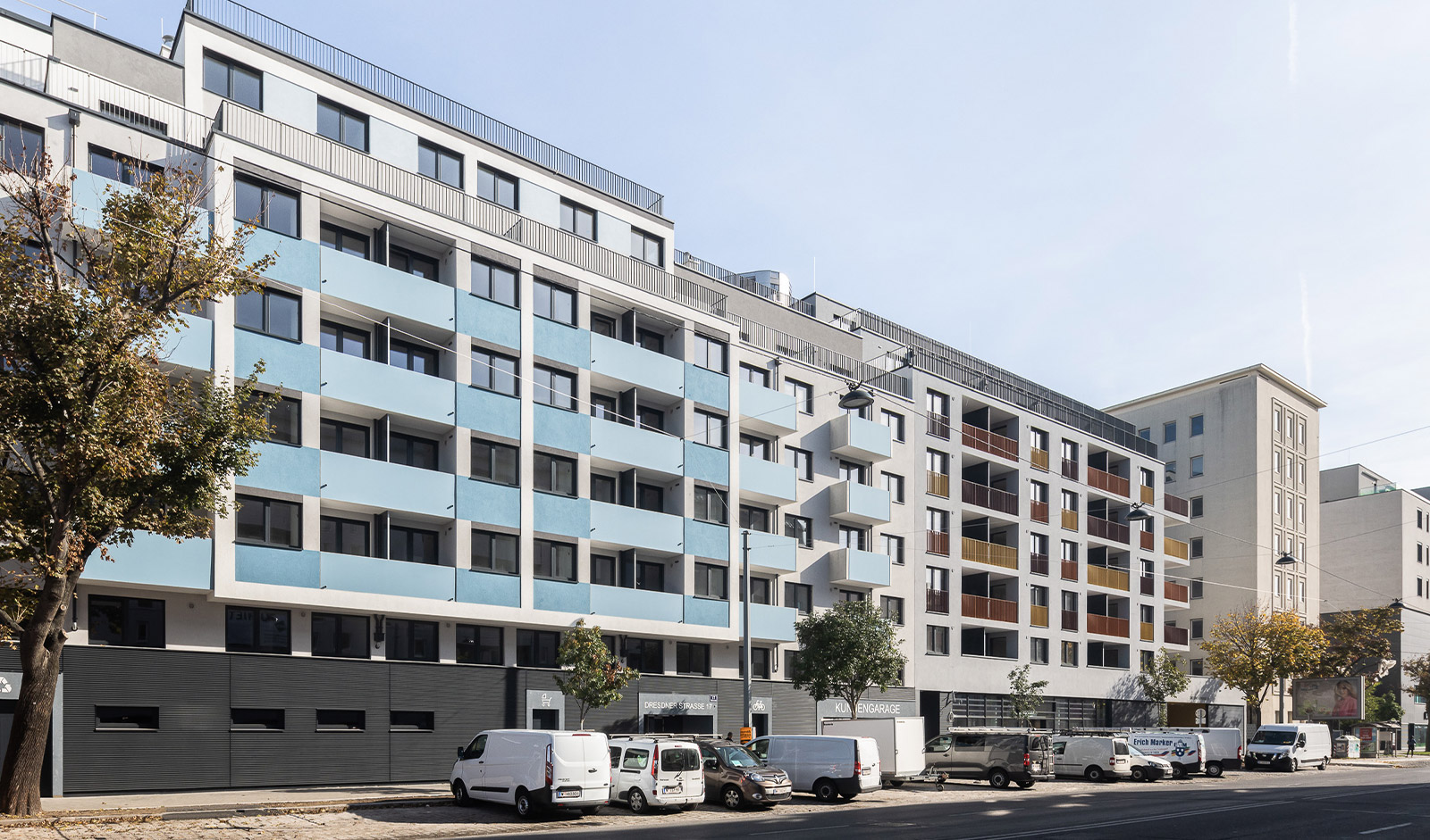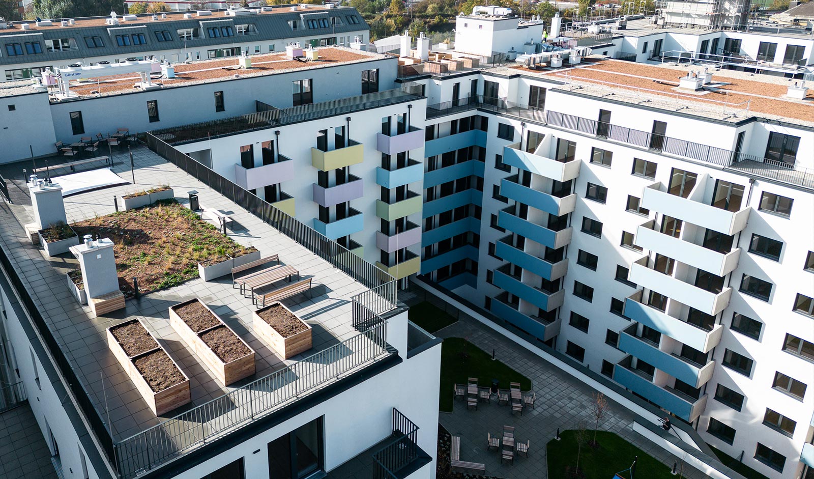 Auf einer ehemalig voll bebauten Gewerbebrache ist nun modernes Wohnen entstanden. Die Wohnungen im Erdgeschoß und im ersten Obergeschoß verfügen über Eigengärten, die übrigen haben Balkone und Loggien. Die beiden großzügig begrünten Innenhöfe sorgen für eine ruhige Lage direkt an der Dresdner Straße, die Erhöhung des Grünanteils verringert darüber hinaus den Hitzeinseleffekt der Liegenschaft.