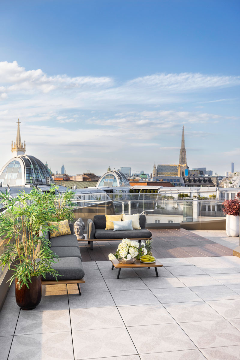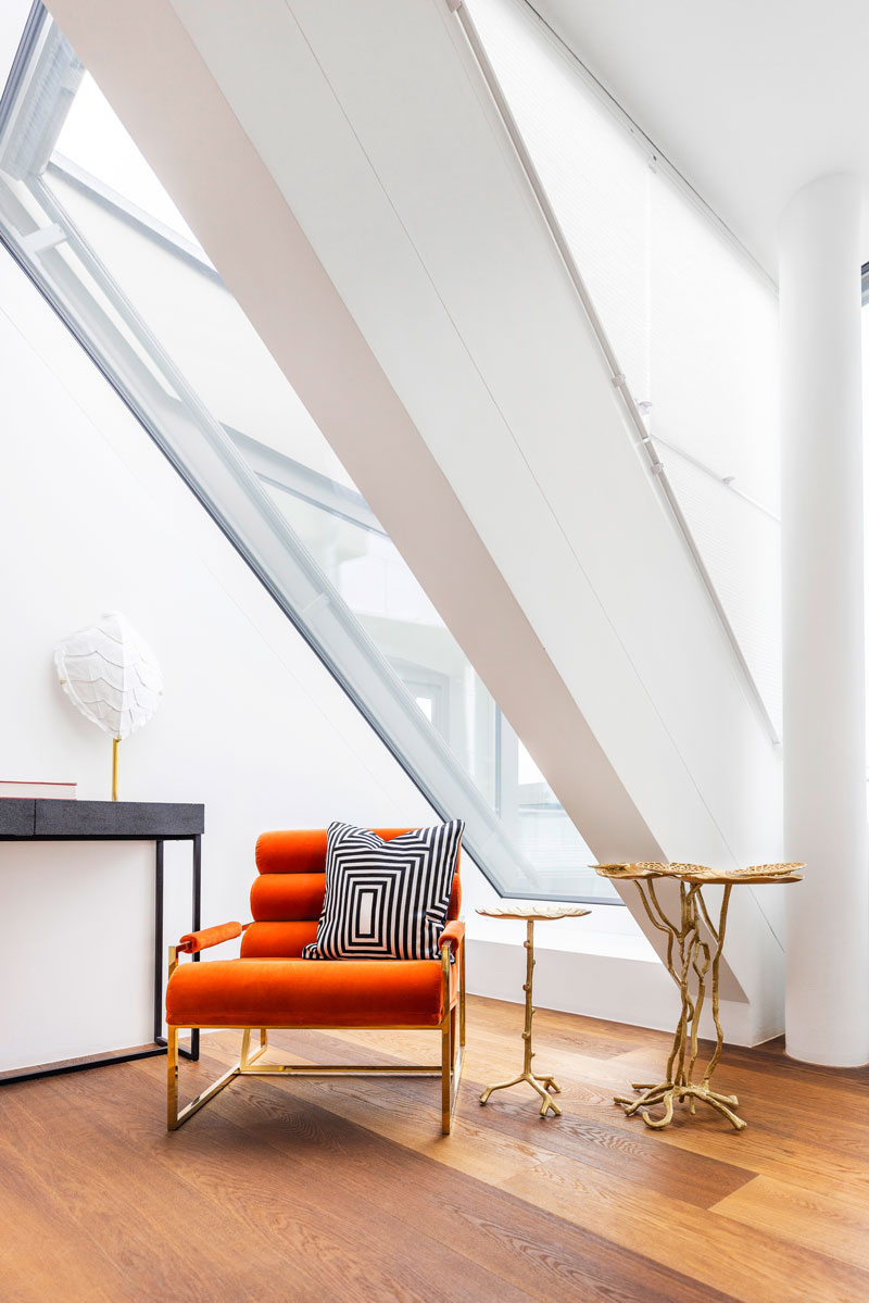 Im 5. Obergeschoss dieses hochmodernen High-End-Umbaus und -Dachgeschoß-Aufbaus wurden 720 m² Wohnfläche auf neun Wohneinheiten mit sehr großzügigen Zimmern aufgeteilt, jede einzelne davon mit eigener Freifläche.