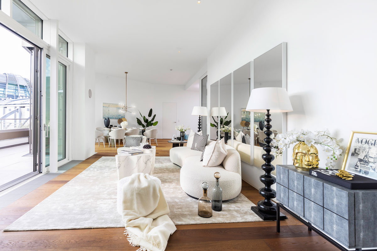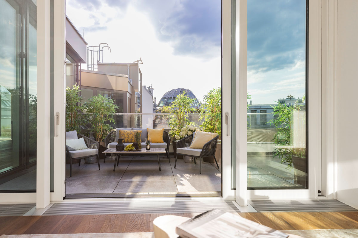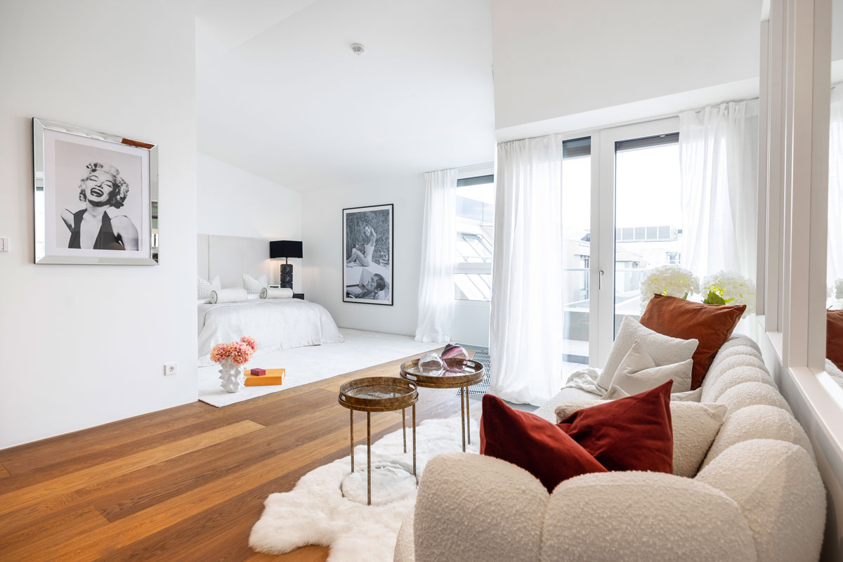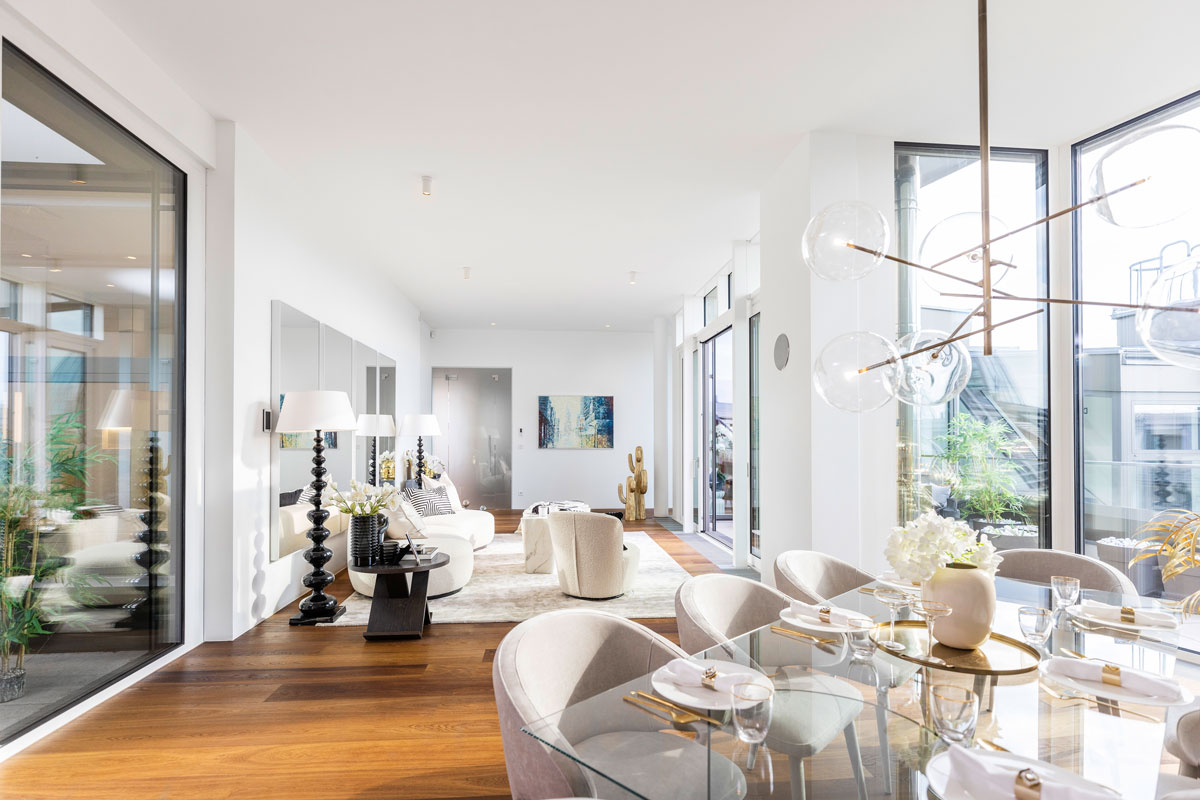 Im 1. Dachgeschoss entstanden zwei beeindruckende Penthouses mit bis zu 3,5 m Raumhöhe, 360°-Rundumblick sowie begrünter Dachlandschaft samt möglichem Outdoor-Spa und Außenküche. Edle Komponenten sind hier selbstverständlich. Die Ausstattung wurde sorgfältig ausgewählt und besticht durch ausgesuchte Qualität.
